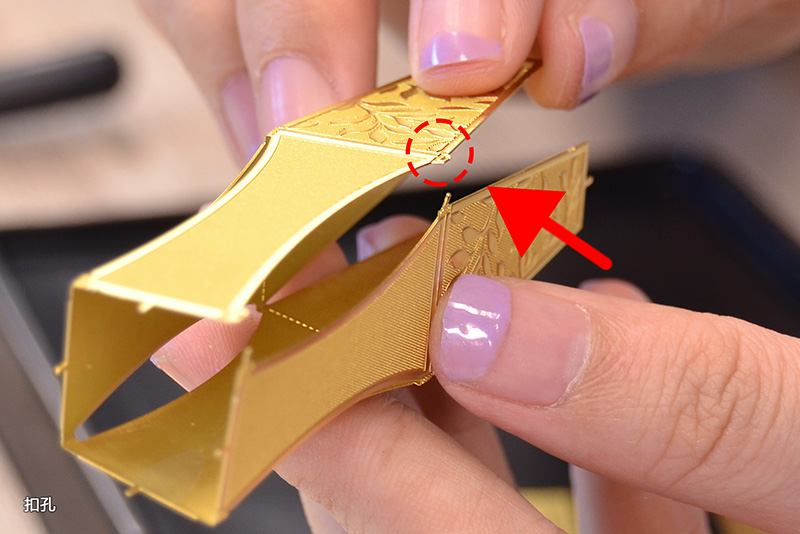 扣孔位于金屬零件邊緣,其形狀為“回”字形狀,扣孔的孔位為空心,其空心尺寸約 1.35mm x 0.3mm 大小。扣孔相對應(yīng)的是扣點,拼裝時參見拼裝說明書步驟,將圖紙上零件扣點部位與扣孔部位穿插后,再進行平折或彎折動作,起到拼裝固定零部件的作用。