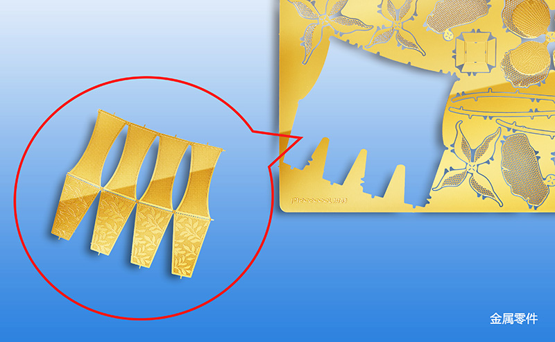 金屬零件是拼裝為成品金屬模型的組成部份,金屬零件初始位于金屬片板件上,每張金屬片板件排列著幾個(gè)至幾十個(gè)數(shù)量不等的金屬零件,每一個(gè)金屬零件在拼裝說(shuō)明書或零件示意圖上都能找到獨(dú)立的零件編號(hào)。成品模型是參見拼裝說(shuō)明書,按圖紙步驟將金屬板件上的金屬零件剪下后,逐步拼裝而成。