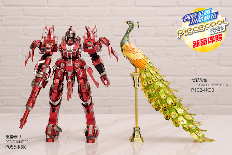 七彩孔雀在設計可謂匠心獨運,不僅外觀精致,更巧妙的是,只用了32/4片11cm x 21cm 的金屬片,卻做出了一個和雷霆赤甲大小相當的模型。類似雷霆赤甲、磁旋藍甲、御天金甲這樣的大模型,一般都需要十余片金屬片來制作,而七彩孔雀因為設計巧妙,用3片金屬片就實現了。 雷霆赤甲的尺寸是L21cm x W17cm x H22.5cm,而七彩孔雀的尺寸是L23.9cm x W8.5cm x H23cm,在高度上甚至比雷霆赤甲還要高一點。